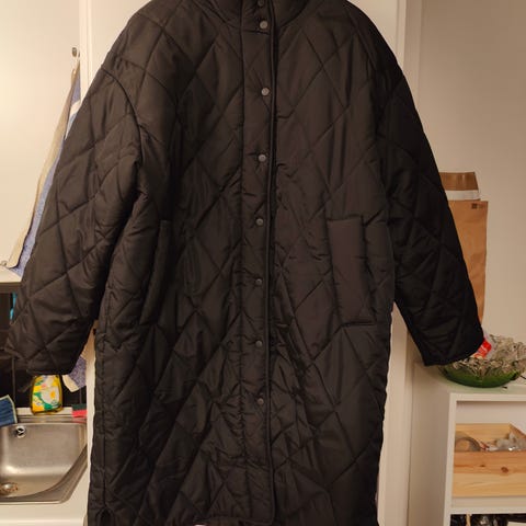 Uusi itselle liian pieneksi todettu beige kevyttoppatakki. Melkein nillkoihin asti. Vetoketjukiinnitys. Sivuissa taskut ja irroitettava huppukin on. Koko 50.