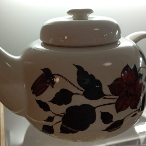 Kaunis valkoinen teepannu ja mukit syksyn pimeneviin iltoihin.
