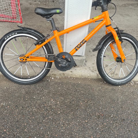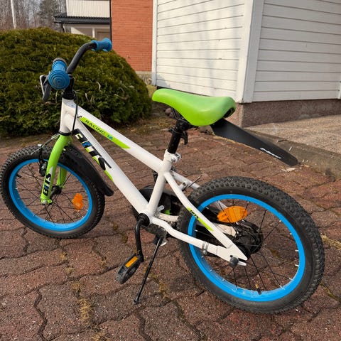 Lapsen kevyt ja laadukas pyörä käsijarruilla. Muutoin hyvässä kunnossa, mutta pala ketjusuojasta lohjennut, satulassa ja jarrukahvoissa kaatumisesta naarmuja. Renkaat hyvät ja kaikki toimii.