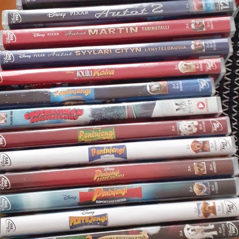 Lasten dvd elokuvia, joissain pieniä naarmuja mutta kaikki ovat toimivia. Yht hp. 20e. Nouto vantaa.
