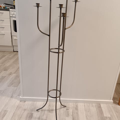 Kolmihaarainen kynttelikkö puusta, kupariset kynttiläpidikkeet