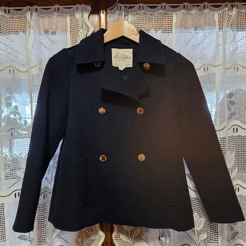 Todella siisti, tahraton ja mielestäni myös hyvin vähän nukkaantunut musta villakangastakki. En kuitenkaan aivan tohtinut Kuin uusi -luokitusta valita.