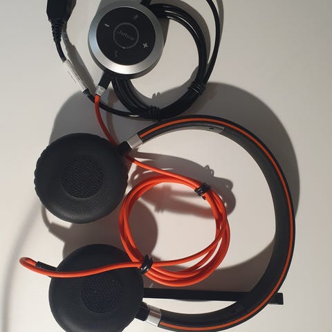 Jabra Evolve kuulokkeet mikrofonilla ja suojapussilla. Mallista en ole varma, mutta olisiko 40 UC Duo mitä googlesta katsoin. Toimivat kuulokkeet äänenvoimakkuussäätimellä.