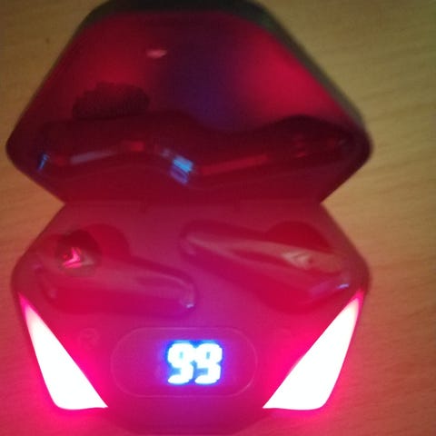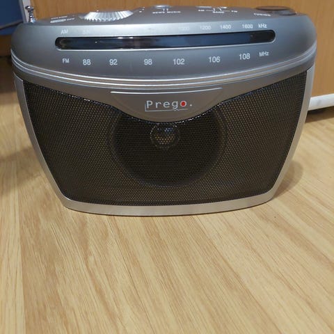 Kuulokeradio. Latautuu johdolla "telineessä olevasta ( uusittavasta AA-patterista.) -Lataus aloitetaan käntämällä On/off nappi päälle = punainen valo syttyy: kuulokkeet latautuu).. . Patteri Kestää kauan..