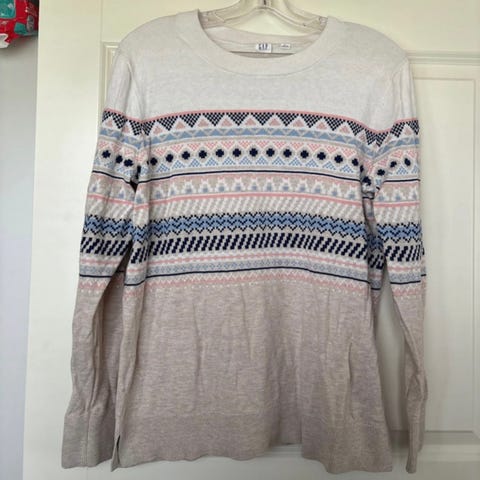 Myydään raidallinen Gap merkkinen neule koko M. Sininen valkoisilla raidoilla, v-aukko.
