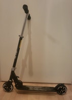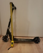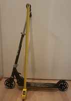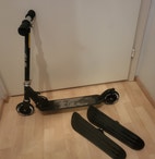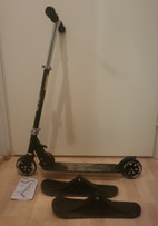 Tällä potkulaudalla liikutaan kesällä pyörillä ja talvella suksilla! Helposti vaihdettavat osat, ja työkalu mukana. Menopelin saa kuljetuksen ja säilytyksen ajaksi taitettua. Korkeuden saa säädettyä, kuvissa on suuntaa-antavat mitat.