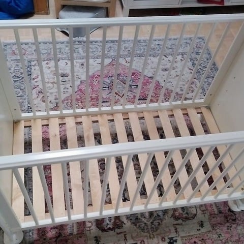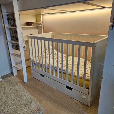 Sängyn koko 60 x 140, korkeus n. 90 cm. Pohja lattiasta n. 30 cm korkeudella. Laidat n. 60 cm korkeita. Patja tulee mukaan ja lakanat.