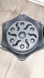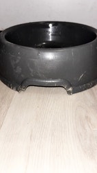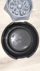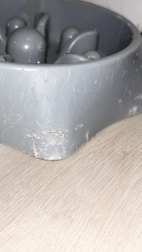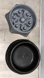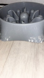 Hitaasti syötettävä koiran ruokakuppi harmaasta muovista. Kupissa on erilaisia muotoja ja kohoumia, jotka hidastavat ruoan syömistä. Käytetty, näkyvissä kulumisjälkiä ja naarmuja. Sopii koirille, jotka tarvitsevat ruokailun hidastamista.