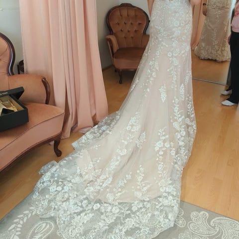 Myydään White Storyn valkoinen pitsipäällystyinen häämekko koossa 46 (vastaa kokoa 44). Rinnan kohdalta hiukan kavennetty ja lyhennetty helmaa. Itse olen 165cm pitkä ja kengissä noin 5cm korko. Käyttämätön peruuntuneiden häiden takia. Helmassa sovituksen yhteydessä hieman likaa, ei näy ulospäin. Lappu kiinni mekossa vielä. Ostettu Lavemista. Saa tulla sovittamaan Hämeenkyröön. UKR koko 52.