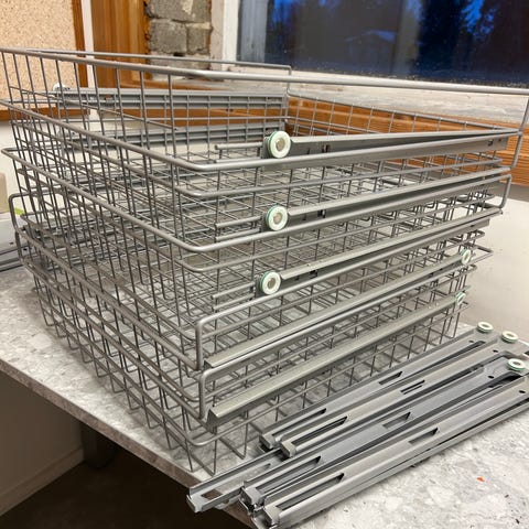 3 kpl hyväkuntoisia, tukevia kaappiin kiinnitettäviä rullakoreja + kiskot. Sopii 50 cm kaappiin. Leveys 45 cm, (lisäpalan kanssa 46,5 cm ), syvyys 50 cm, korkeus 10 cm.