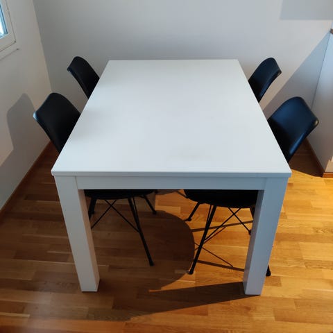 Myydään Laulumaa-sarjan kuuden hengen ruokailuryhmä, pöydän pituus 200cm ( 150cm + 50cm jatkopala), leveys 100cm korkeus 74cm.