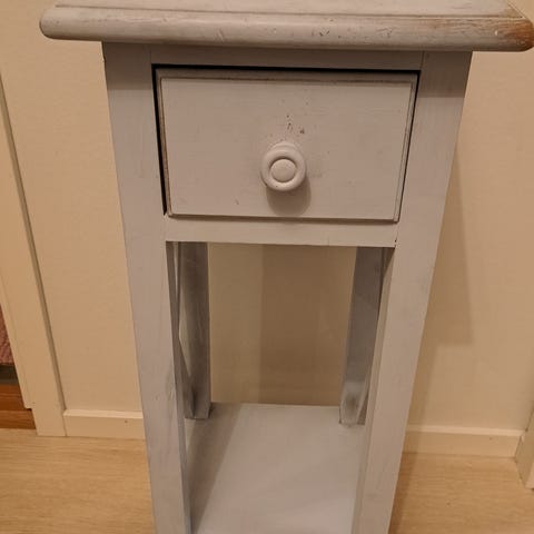 Monikäyttöinen viehättävä käsinmaalattu säilytyslipasto / pikkupöytä (esim. lasten-huoneeseen) kauniilla puuleikkauksilla. Mitat: leveys 60 cm, syvyys 32,5 cm, korkeus 30 cm.
