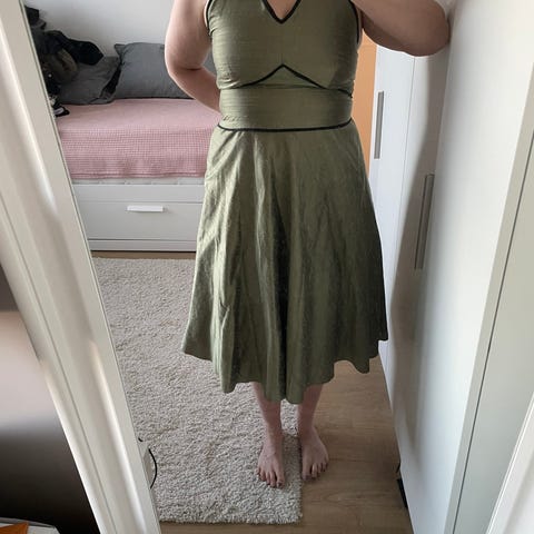 Vietnamissa teetetty halterneck- silkkimekko kaasoiluun. Selässä koristenyöritys, murattiaiheiset koristekirjailut. Mukaan tulee vielä hakaneulalla kiinnitettävä ruusuke vyötärölle tms. Lisäksi pala vihreää mekkosilkkiä mukaan.