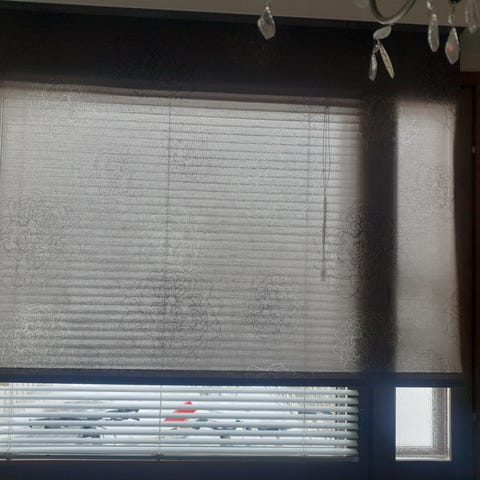 Kaunis meleeratun lilan värinen rullaverho, hyvä pimennysverhona. Sitä on kokeiltu mutta olikin liian kapea ikkunaan, joten se jäi tarpeettomaksi.