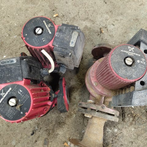 Kiertovesipumppuja ja säätömoottoreita karoineen. Lämmönvaihdin
