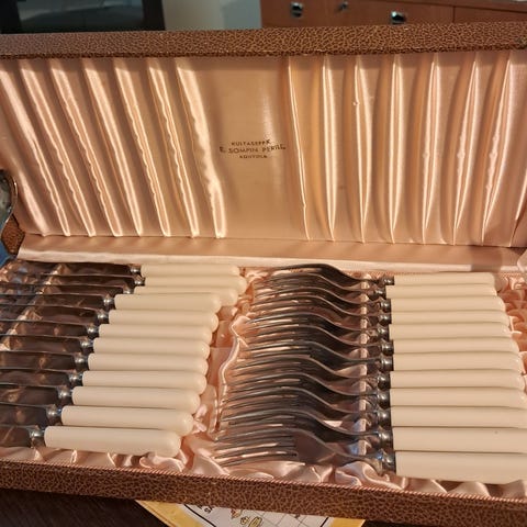 Neljä jälkiruoka veistä 17cm ja yksi jälkiruokalusikka 13,5cm. Aterimet ovat käytettyjä ja niissä näkyy käytön jälkiä. Sopii keräilyyn tai käyttöön.