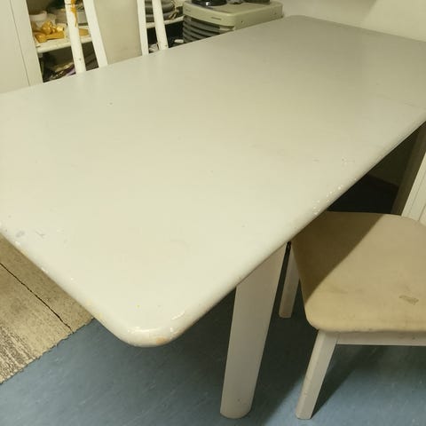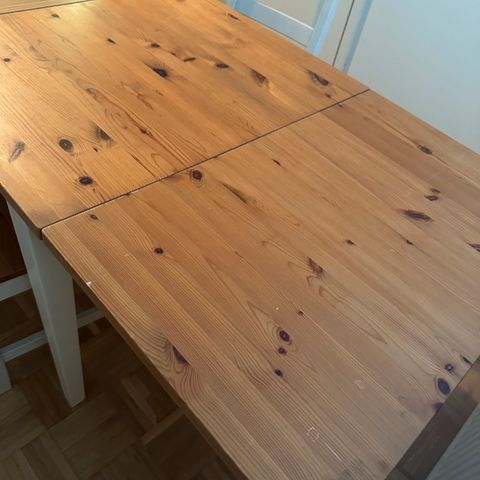 Käyttökelpoinen pöytä + 4-tuolia joista yhdestä tuolista selkäpuolelta pinna poikki