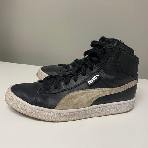 Oikein siistit Puman valkeat tennarit koossa 39/25 cm, kapealla lestillä. Toisen kengän kärjessä haaleaa naarmuuntumaa, muuten normaalia käyttökulumaa/haaleaa tummentumaa paikoin. Kantapäät ehjät, säännöllisesti putsattu ja huollettu. Hp. 15 e sis. Pk.