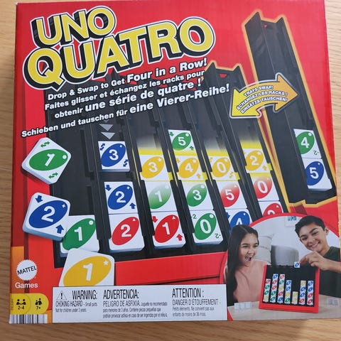 Mattel UNO Quatro 4 riviin peli on UNO ja neljän suora yhdistettynä! Saatko neljä samaa väriä tai numeroa riviin: pystyyn, vaakaan tai vinottain? Lisämausteen peliin tuovat UNOsta tutut erikoislaatat ja muuttuva pelilauta.