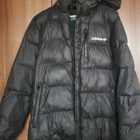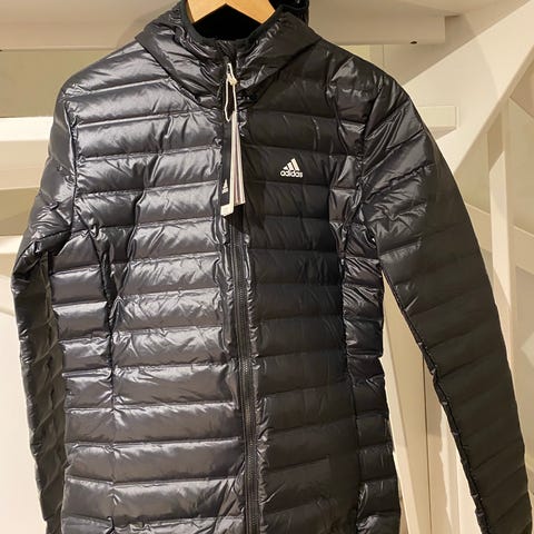 Adidas musta untuvatakki, koko miesten S. Täyte 70% untuvaa ja 30% höyheniä.