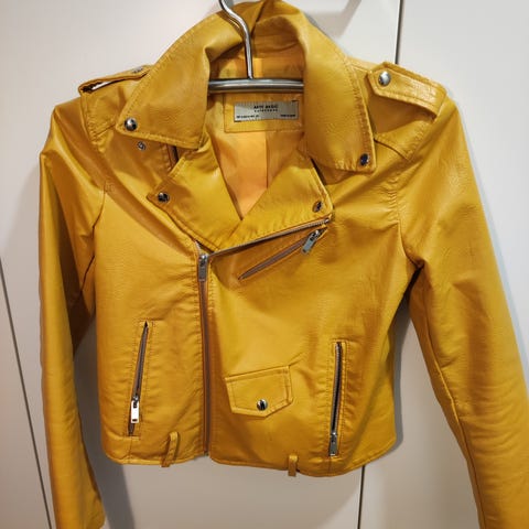 Keltainen takki aitoa mokkanahkaa, koko s (hyvä myös xs). Paristi pidetty. Helmassa muutama lähes huomaamaton "värjäysvirhe" joista kuvat, eivät ole siis tahroja.