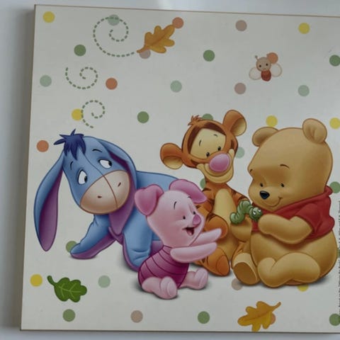 Disney Nalle Puh ja ystävät kehystetty juliste, jossa on hahmot Nalle Puh, Tiikeri ja Pipsa. Juliste on värikäs ja esittää hahmot istumassa puun juurella. Kehys on kullan värinen ja julisteen koko on noin 25,5 cm * 20,5 cm. Soveltuu lastenhuoneen seinäkoristeeksi.