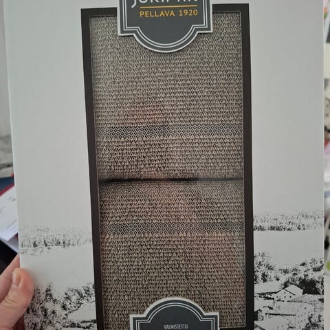 Myydään uusi ja käyttämätön Jokipiin pellavan Laituri- lahjapakkaus. Pakkauksen on suunnitellut Vappu Pimiä.