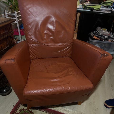 Tässä on mukava rottingista valmistettu nojatuoli Tuoli on kevyt mutta tukeva, ja siinä on pehmeät, vaaleat pehmusteet, jotka tekevät istumisesta mukavaa. Setissä on havaittavissa käytön jälkiä, kuten pieniä naarmuja ja kulumia, mutta yleisilme on siisti. Vaikka tuolissa on kaksi katkennutta keppiä ei se ole haitannut.