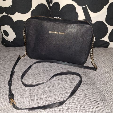 Michael Korsin Jet Set -sarjan musta crossbody kultaisilla metalleilla. Kestävää saffiano-nahkaa. Säädettävä olkahihna. Takaosasta hieman painunut kasaan, muuten siistissä kunnossa. Aito, ostettu aikoinaan Booztilta.