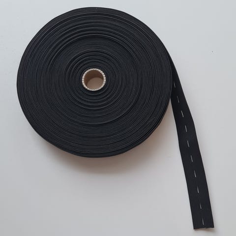 24mm reikäkuminauhaa (tilattu Inka-tuotteelta). Napakka laatu, n 40m luultavasti kiekossa jäljellä. Sopii hyvin vyötärökuminauhaksi