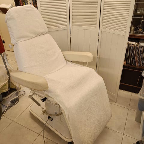 Kuvassa näkyvässä jalkaosassa on pieni nahkavaurio, mutta se ei vaikuta tuolin toimivuuteen. Kaikki alkuperäiset osat ja lisävarusteet kuuluvat kauppaan, mukaan, - Afrodite-lisäkäsituet, jotka lisäävät mukavuutta hieronnan aikana, - Afrodite polvi- ja nilkkatyyny.