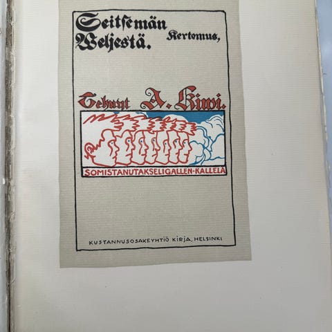 Aleksis Kivi SEITSEMÄN VELJESTÄ, Wsoy 1953, somistanut Akseli Gallen-Kallela, 600 sivuinen puolinahkasidos. Sisältä erittäin hyväkuntoinen. Ex Libris. Kansissa lievää kärsimystä.