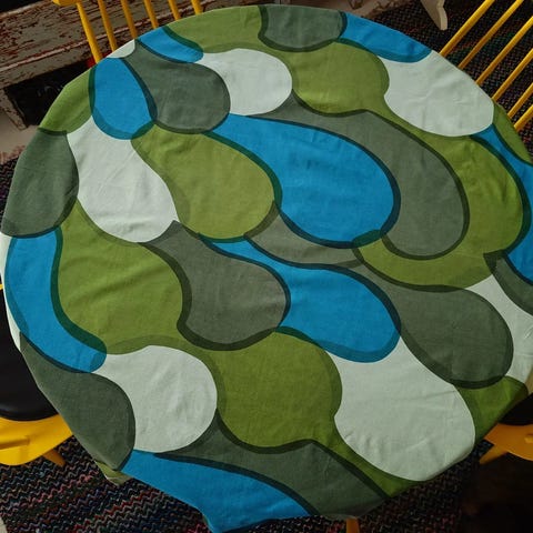 Marimekko Suomi 1961. Pyöreä Maija Isolan Lokki kankaasta teetetty pöytäliina. Värit ruskea ja valkoinen. Materiaalina on luonnollinen, vahva kangas.