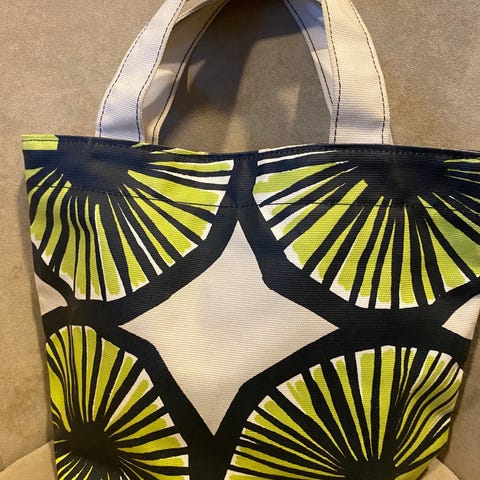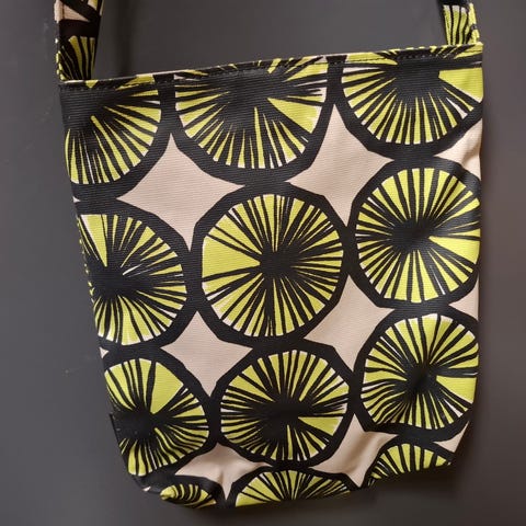 Ihanan pirteä Marimekon olkalaukku Appelsiini-kuosilla paksua markiisikangasta