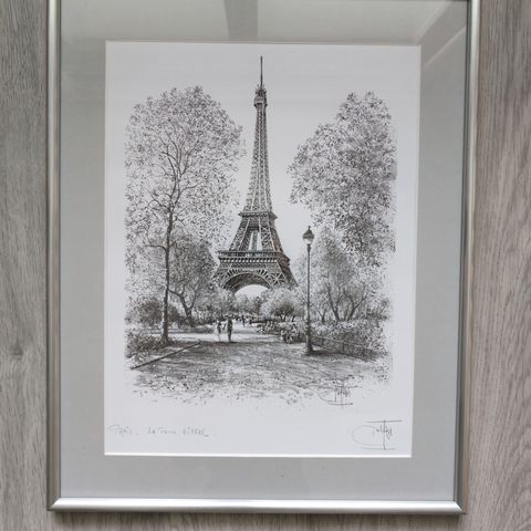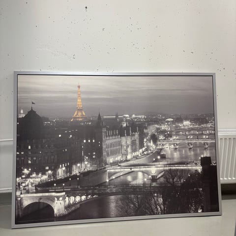 Mustavalkoinen taulu, jossa on Pariisin kaupunkimaisema ja Eiffel-torni yöllä. Taulun koko ja materiaali eivät ole tiedossa. Soveltuu sisustukseen.
