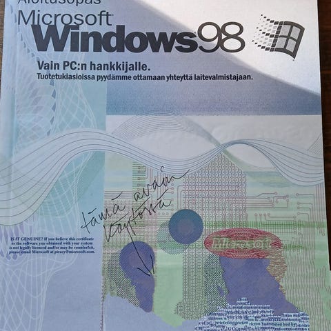 Microsoft Windows 98 Starts Here opaskirja, joka tarjoaa ohjeita ja tukea Windows 98 -käyttöjärjestelmän käyttöön. Kirja on painettu Microsoft Pressin toimesta ja sisältää yksityiskohtaiset ohjeet aloittamiseen sekä vianmääritykseen.