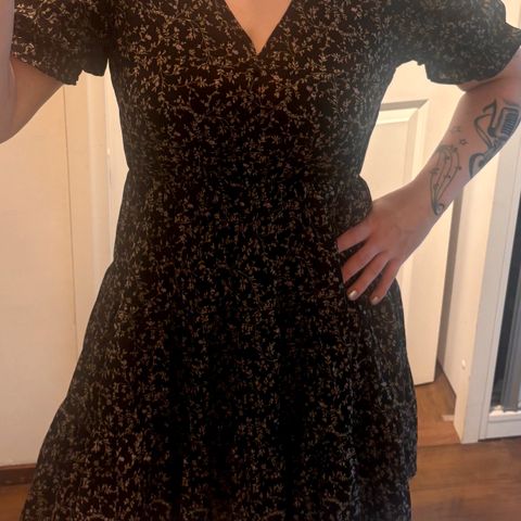 Mekko mustalla pohjalla ja kukallisella kuviolla. Koko M. Kai-kai 47, joustaa reilusti. Valmistettu kevyestä ihanan pehmeästä materiaalista, lyhyet hihat ja helmassa rimpsuosio. Käyttämätön.