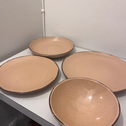 Kaunis setti, kaksi erikokoista lautasta ja muki, käsityötä. Hyvä lahjaidea.