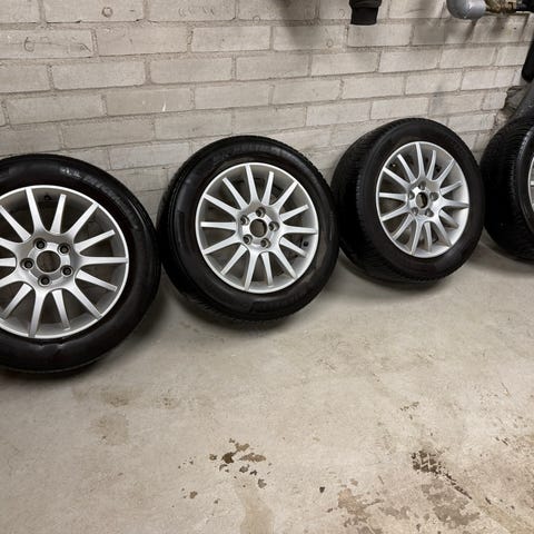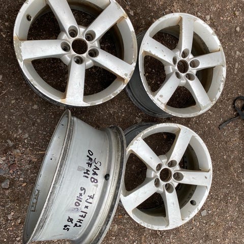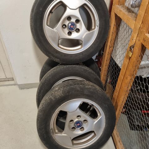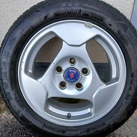 Varastoon unohtuneet Saabin alkuperäiset alumiinikesäkiekot, hyvällä kulutuspinnalla.
