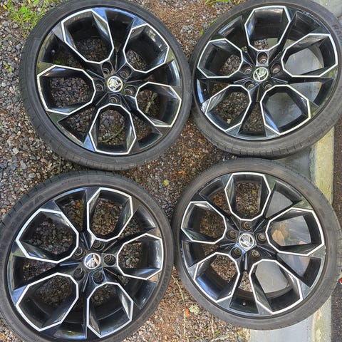 Skodan OEM 19" Trinity vanteet olis ylimääräisenä. Päällä Michelin Primacy 4 renkaat koossa 235/40/19 ja paisto 23. Pintaa renkaissa noin 5mm. Siitä ens kesäksi hyvät vanteet ja kohtuullisilla renkailla.