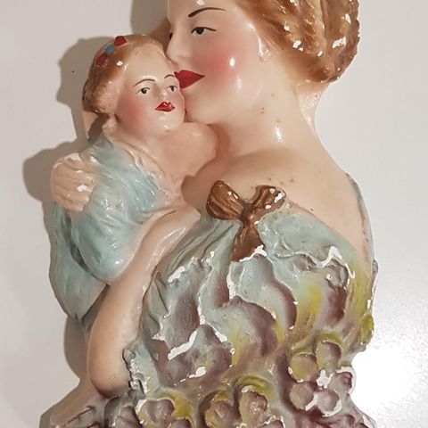 Ilmeisesti aiemmin korjattu toista kättä. Kulhosta lähtenyt pala. Pieniä pintakolhuja maalattu.
