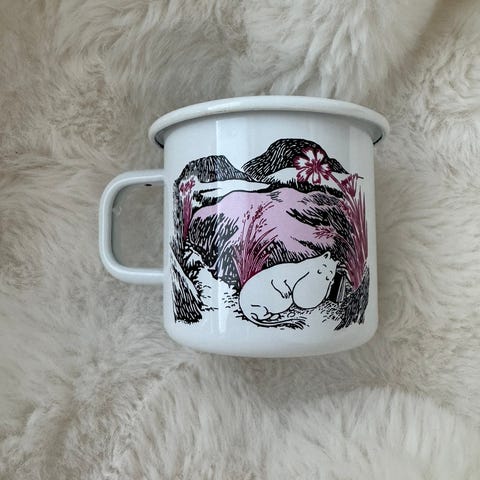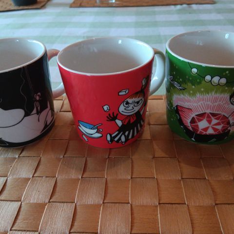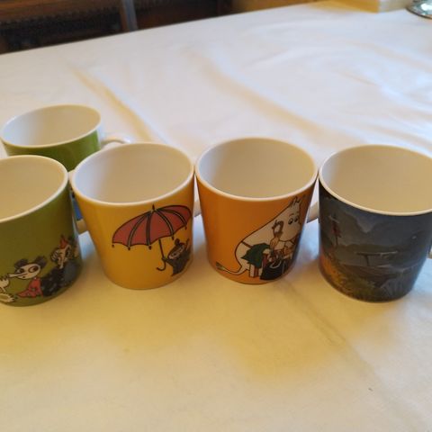 6 kpl emalisia Muumimukeja, kahta eri kokoa. Muutamassa pientä käytön jälkeä mutta ei haittaa käyttöä.