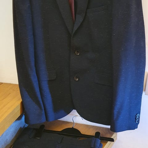 Marks & Spencer M&S Collection miesten juhlava villasekoitepuku, koko M. Väri tumman sininen. Puvun takki on kahden napin malli, sisävuori sininen, koko 50. Housut Regular fit, vyötärönympärys 86 cm (34 tuumaa), sisäsauma 84 cm (33 tuumaa). Nouto Katajanokalta.