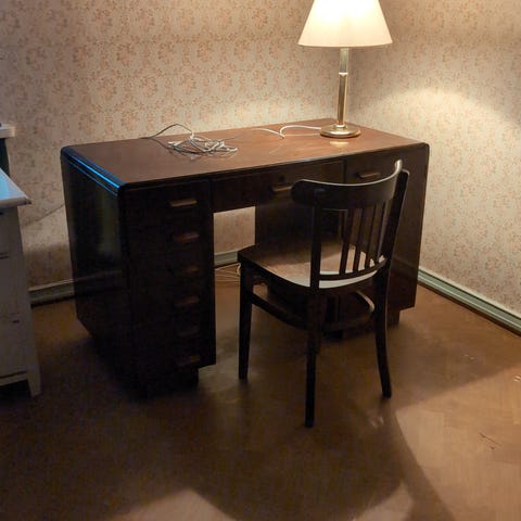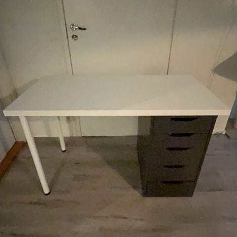 Iso kirjoituspöytä. Levyliitos yhdessä kohdassa irronnut, mutta helposti korjattava esimerkiksi naulauslevyllä pöytälevyn alle. Pöytälevy on kolmessa osassa, eli osia voi myös jättää kokonaan pois.