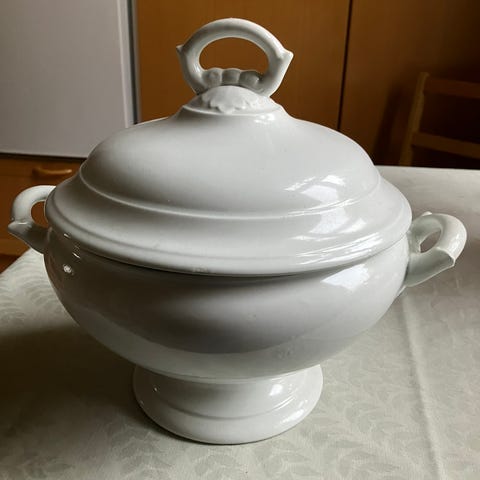 Vanha Kulho joka ehjä mutta ollut käytössä. Emalissa paikoin tummentumia.