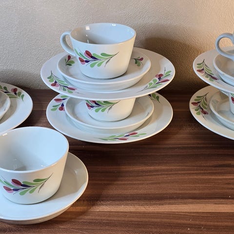 Arabia Selja -astiasto 6 hengelle. Sisältäen ruoka-, keitto-, pullalautaset sekä 6 kahvikuppia + asetit.