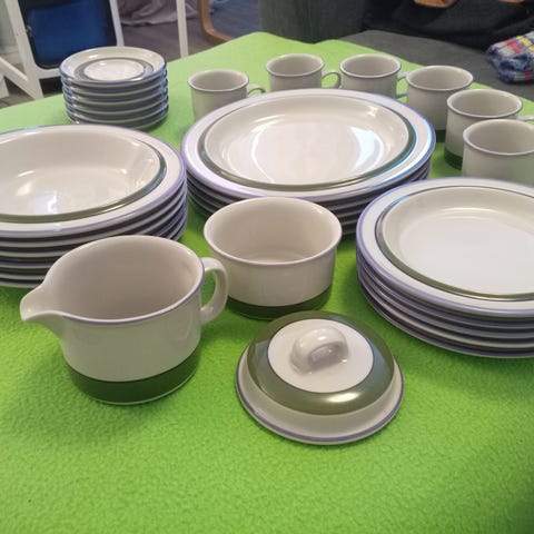Kunto erinomainen — kahden keittolautasen pohjassa kulumajälkiä, mutta ei säröjä, kaikki muut moitteettomia.