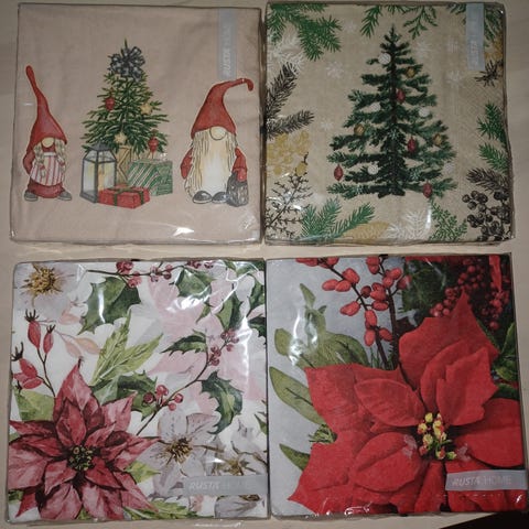 Uusi jouluruokailuliina pakkaus, sis 25 kpl. 33x33. Hinta per kpl