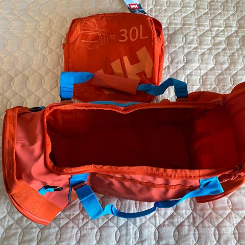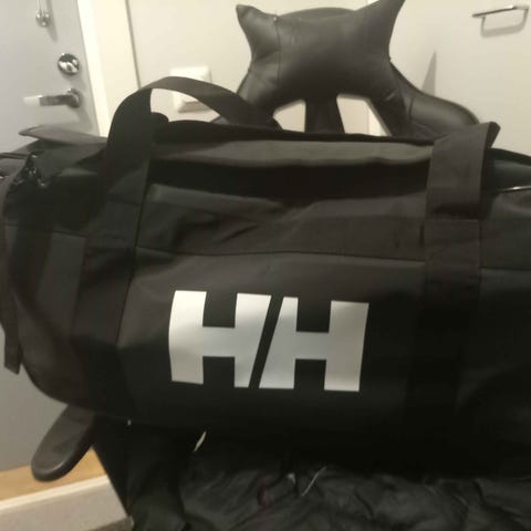 Helly Hansen duffelbag, väriltään musta. Reppu on unisex-malli ja siinä on neopreenitäytteinen hihan suojus, erillinen kenkätasku sekä ensiapupakkaustasku. Mitat noin 72 cm x 38 cm. Vetoketjut moitteettomassa kunnossa ja muutenkin ainoa moite on tarrasta jäänyt tahra (katso kuva). Pientä käytön jälkeä myös.