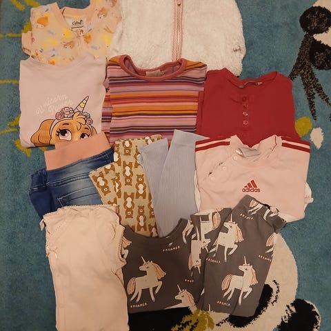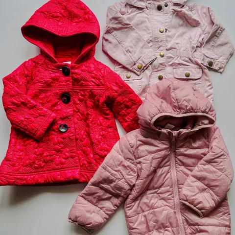 Vaatepaketti tytölle. Setti sisältää vaaleanpunaisen tikatun hupullisen takin Mayoral, vaaleanpunaisen mekon ja harmaan mekon tytöille. Koko 86. Takissa on vetoketju ja napit edessä.